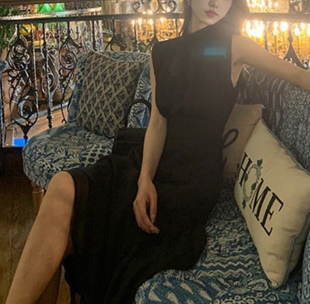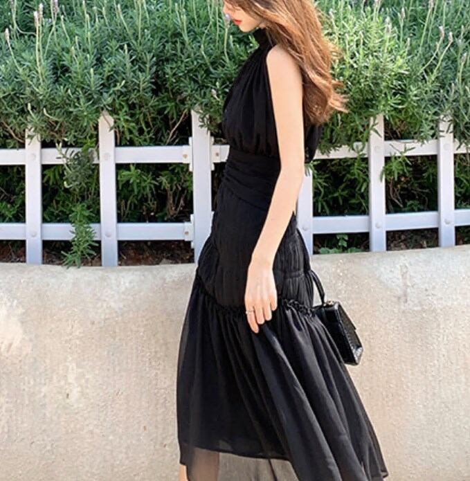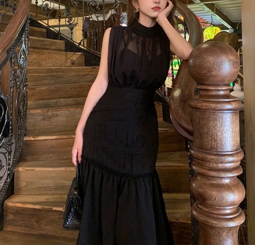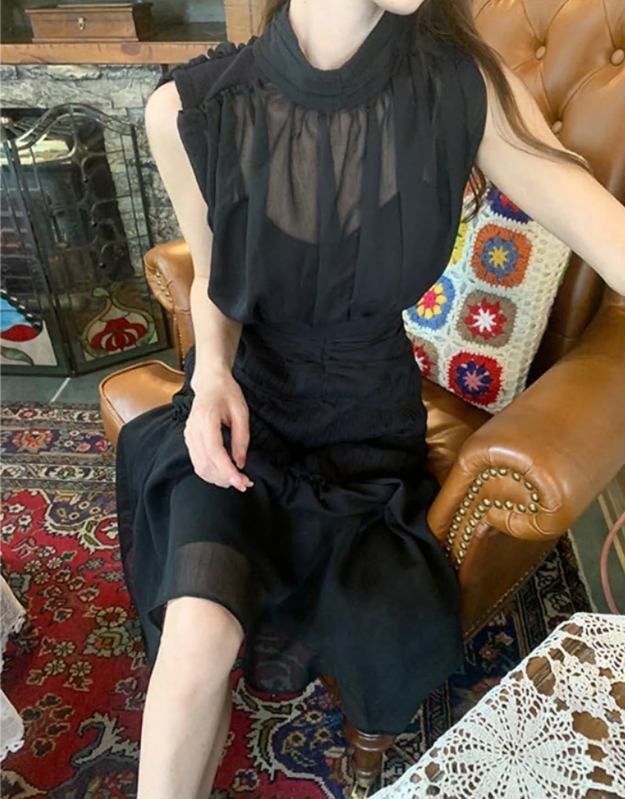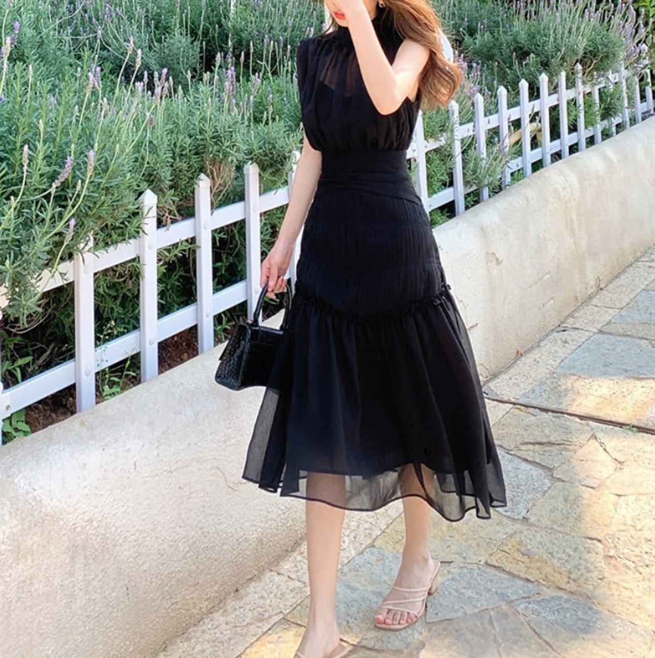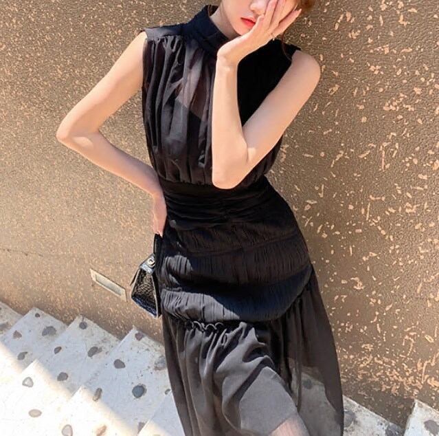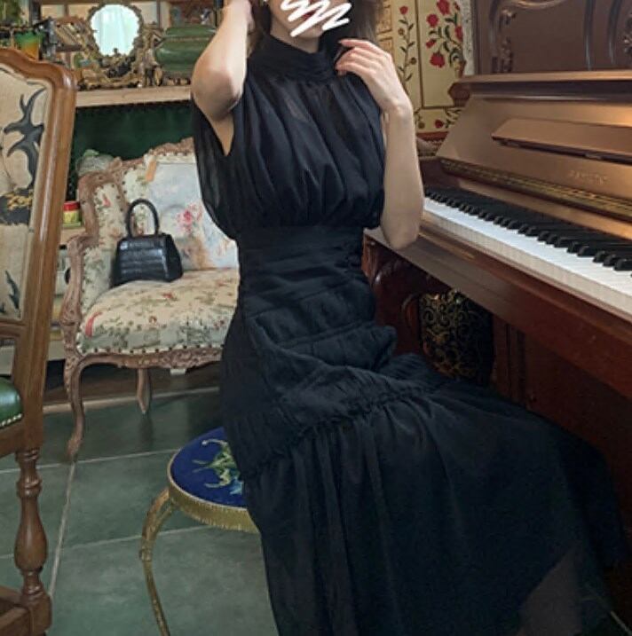 シフォン☆パーティードレス ティアード ノースリ ハイネック