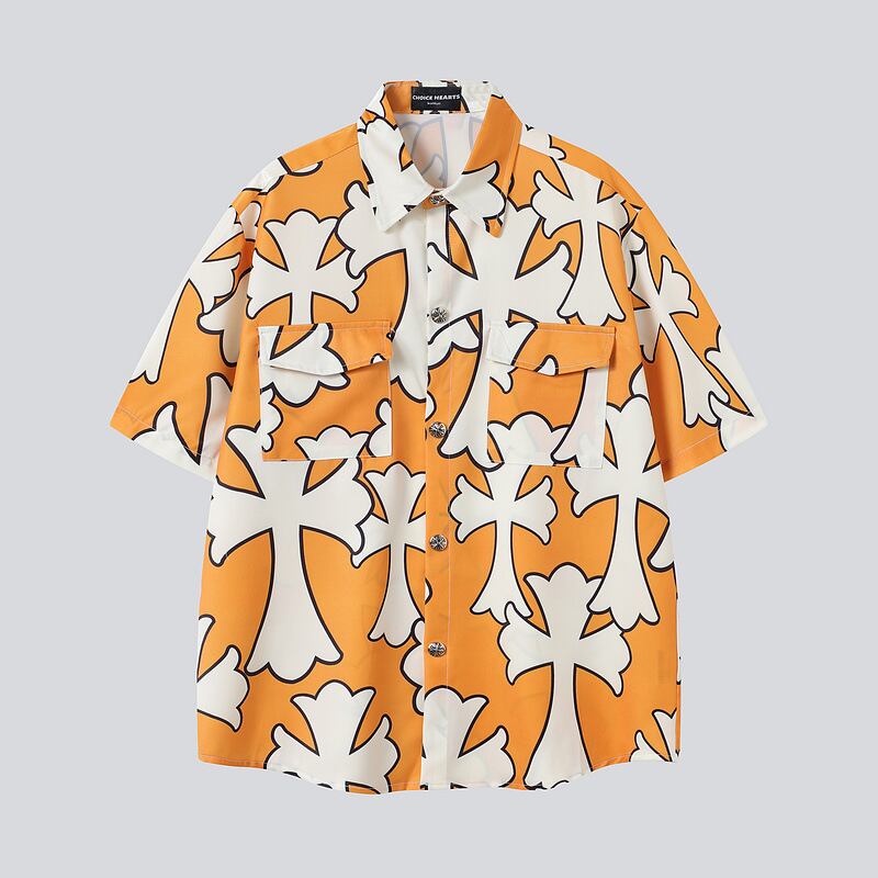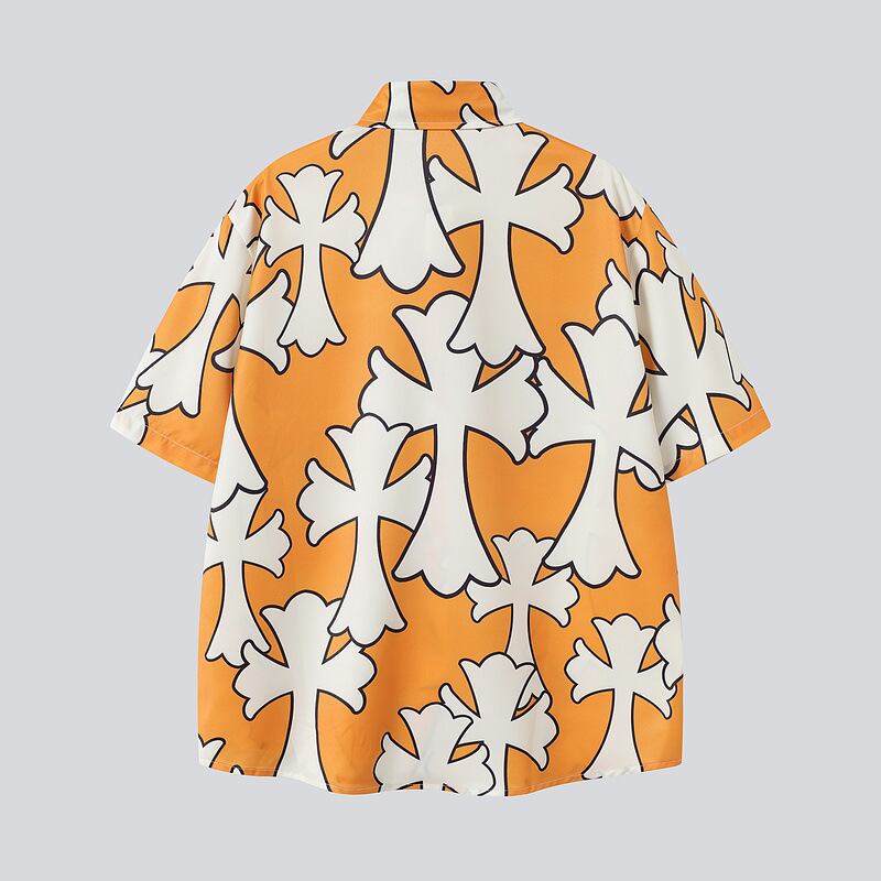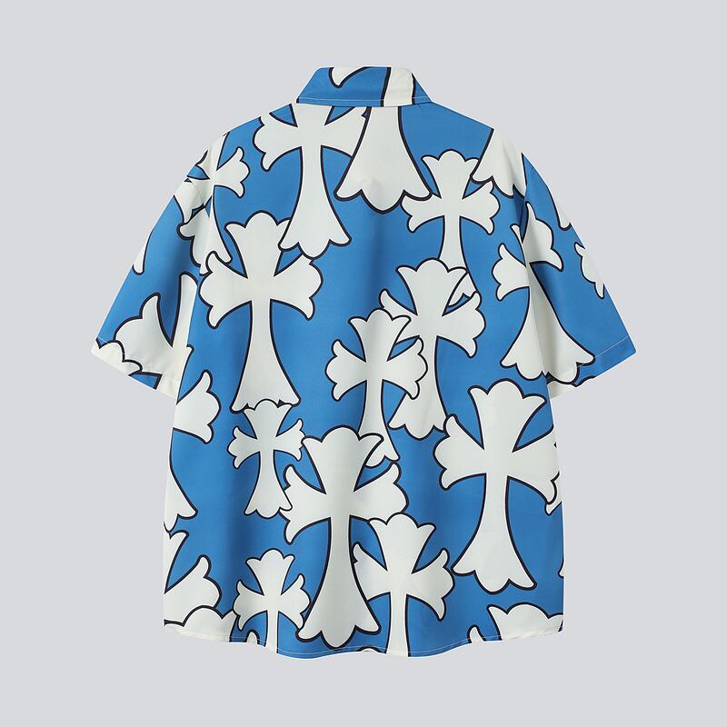 クロス プリント 前開き 半袖 シャツ 男女兼用 ルーズ トップス 2色